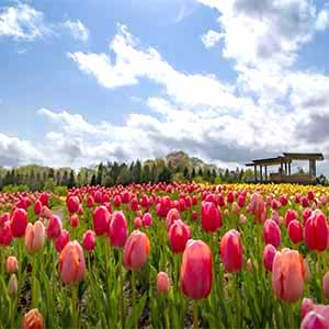 京都駅南口【8:00発】--帝釈峡(昼食)--帝釈峡遊覧船(深緑の神龍湖をのんびりクルージング)--国営備北丘陵公園(圧巻! 10万本以上のチューリップ観賞)--庄原市1泊【桜花の郷ラ・フォーレ庄原=露天風呂】